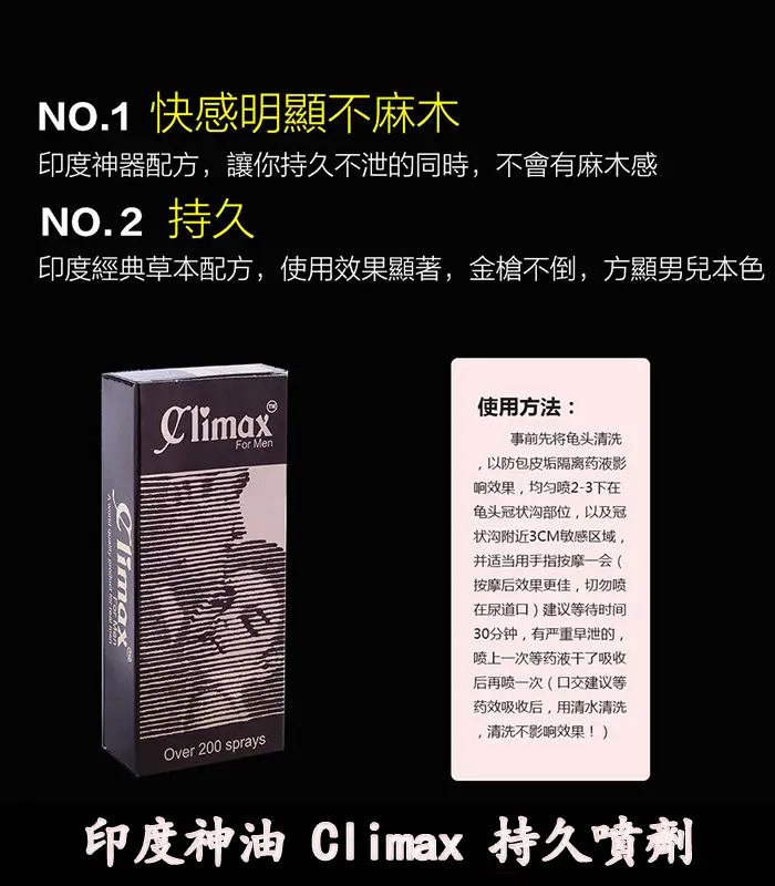 印度神油 Climax 是一款來自印度的傳統男性延時噴劑,專為改善早洩、延長性愛時間所設計。產品以天然草本精華為主成分,能在短時間內幫助男性降低陰莖敏感度,有效延長射精時間,提升性滿意度與自信心。