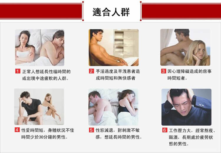 【適應人群】:陽痿早洩、勃起不堅、性慾低下、腎虛乏力、射精無力、手淫過度、事後疲勞、中途疲軟,性生活時間短。