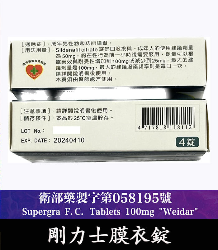 剛力士 100mg Supergra 強效助勃膜衣錠 4錠裝丨原廠正品