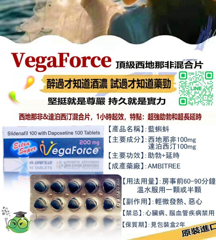 印度藍蝌蚪 VegaForce 由印度知名藥廠嚴格研發生產,是結合 助勃(西地那非 Sildenafil) 與 延時(達泊西汀 Dapoxetine) 兩大功效的雙效型口服壯陽藥。