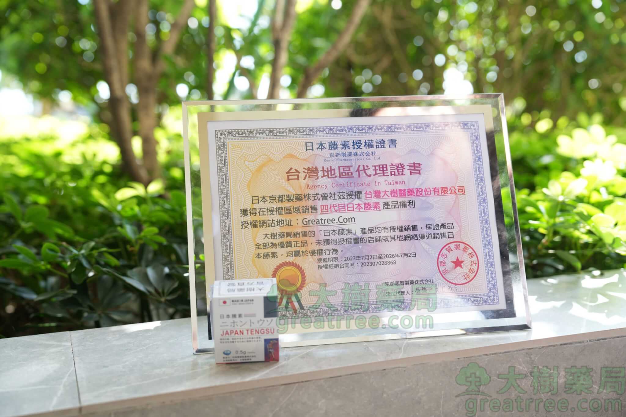 圖片為日本藤素總公司 京都資賀製藥總公司官網下發的授權證書:因亞洲地區偽藥氾濫。請消費者認準官網總代理“大樹藥局”下單購藥
